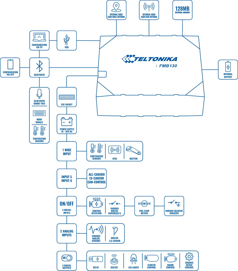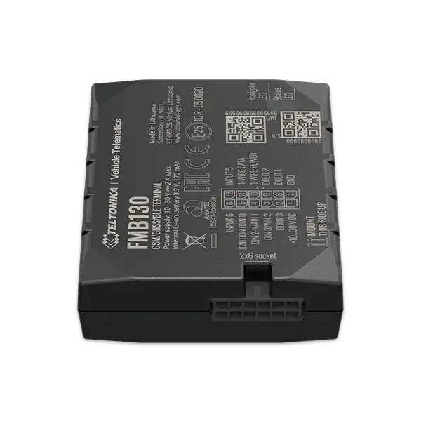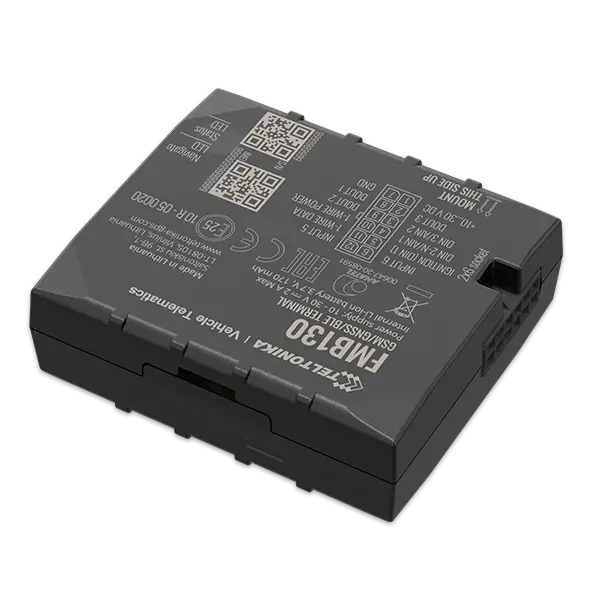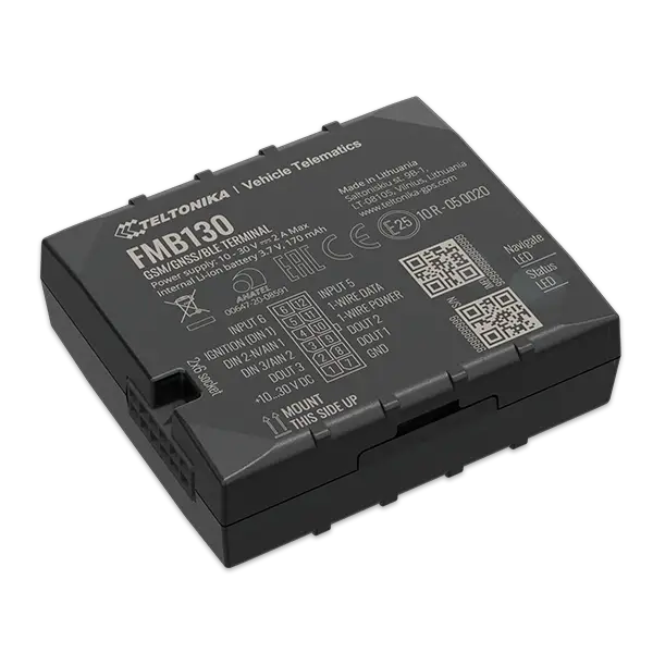 FMB130 is ADVANCED tracker with internal GNSS, GSM antennas, configurable digital/analogue inputs/negative input/impulse inputs, three DOUT outputs, Bluetooth connectivity and backup battery.